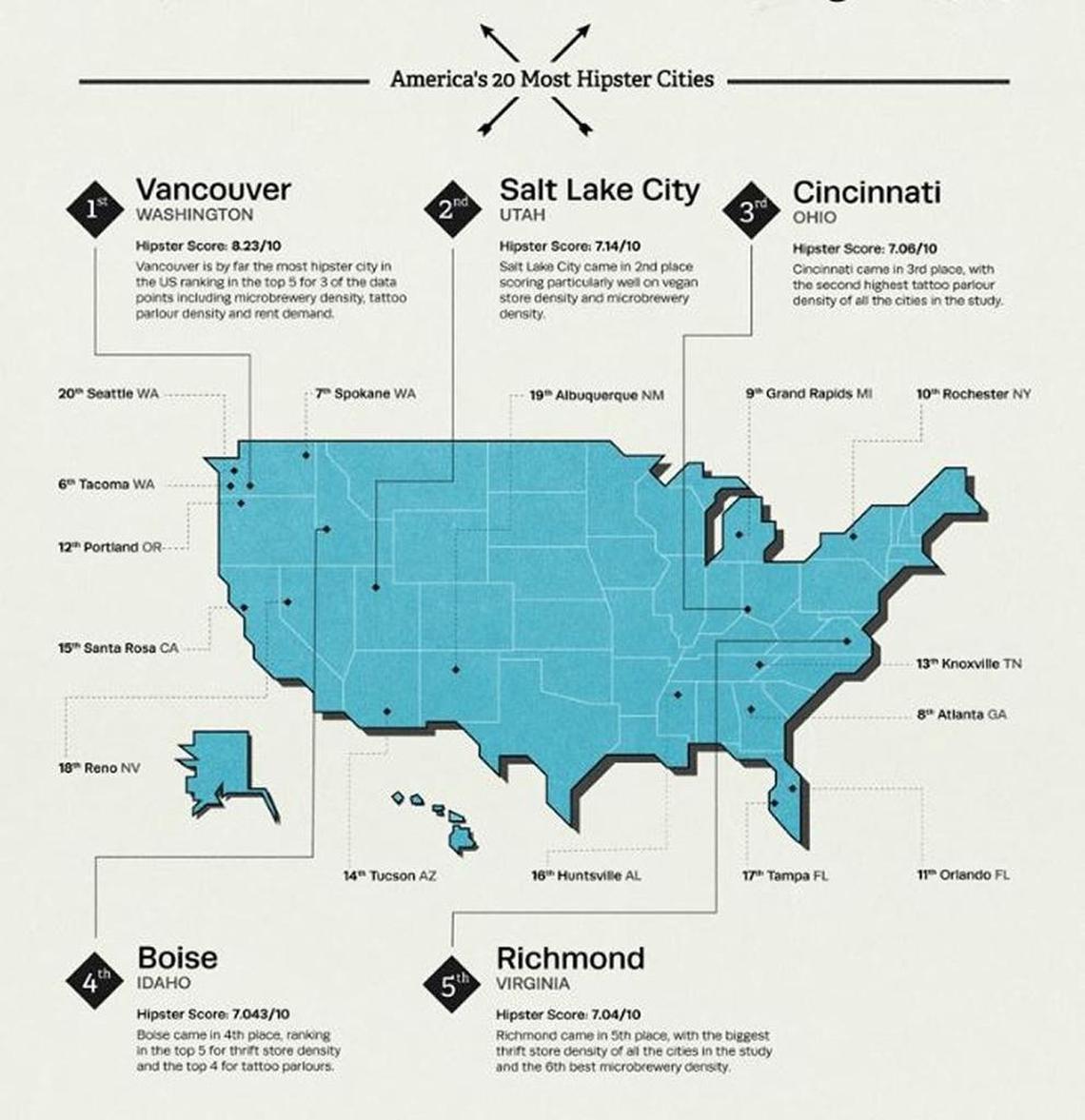 Three cities beat Boise in the U.S. Hipster Index: Vancouver, Washington, was No. 1, followed by Salt Lake City and Cincinnati.