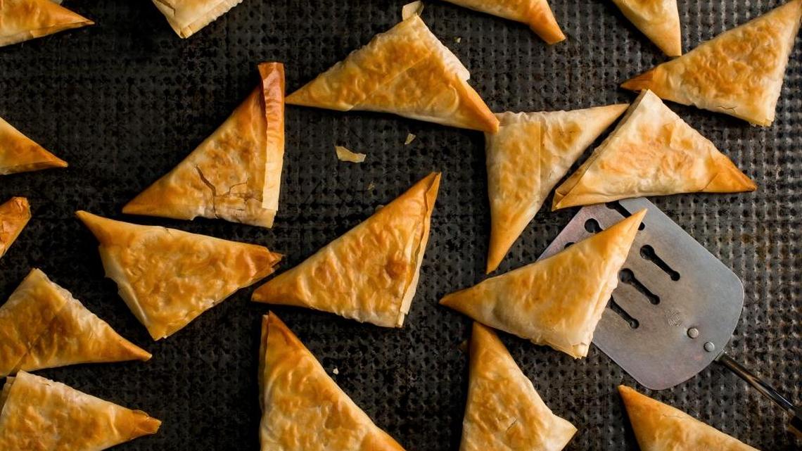 I try to get ahead with savory hors d’oeuvres that I can freeze until I need them for a party. Baked Greek phyllo triangles — tiropites — are my favorite in this department.