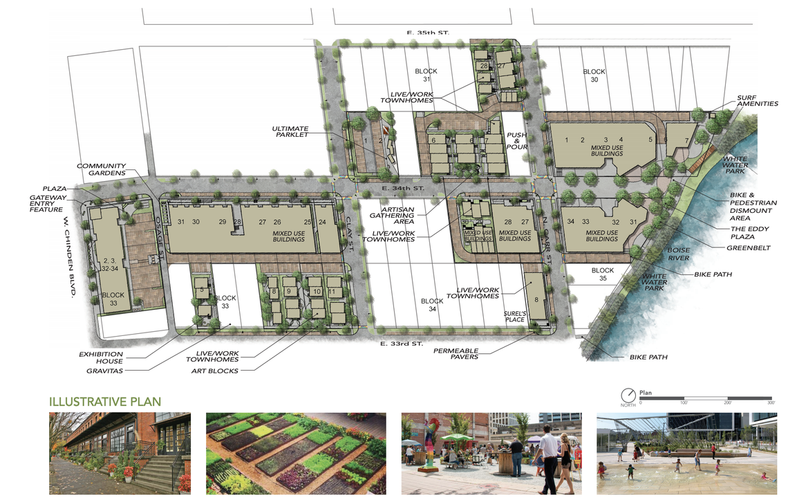 Urban Land Development, owned by developer Hannah Ball of Garden City, is asking the City Council to approve a specific area plan for 34th Street, Carr Street, Clay Street, Chinden Boulevard, Osage Street and 33rd Street along the Greenbelt. The plan would feature mixed-use buildings near the Boise River and Whitewater park, plus townhomes south of N. Carr St. Most of the land to be developed is owned by an LLC managed by Ball and Richard Phillips of Boise.