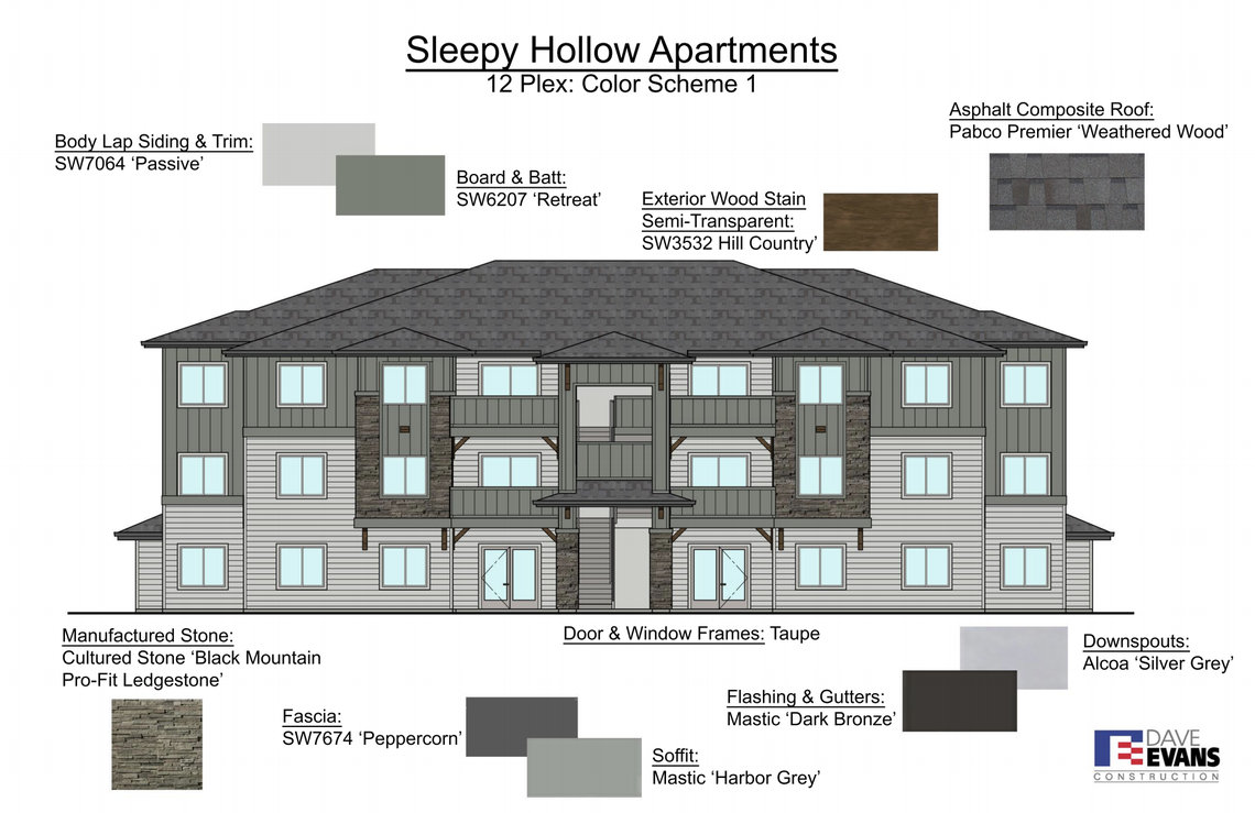 Jack L. Benson of Boise seeks to build an apartment complex called Sleepy Hollow on a 3-acre site at 9555 W. State St. The complex would include 44 three- and two-bedroom apartments spread across four buildings. The property is within the C-2 zoning district and the residential low-density designation of the comprehensive plan.