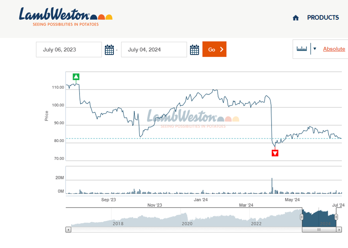 The lawsuit said the disclosures caused Lamb Weston stock, which trades on the New York Stock Exchange under the symbol LW, to fall by $19.59 per share, or over 19%. On Tuesday, Lamb Weston shares were trading at about $79 per share, 30% below their 52-week peak of $113.28, set on July 23, 2023.