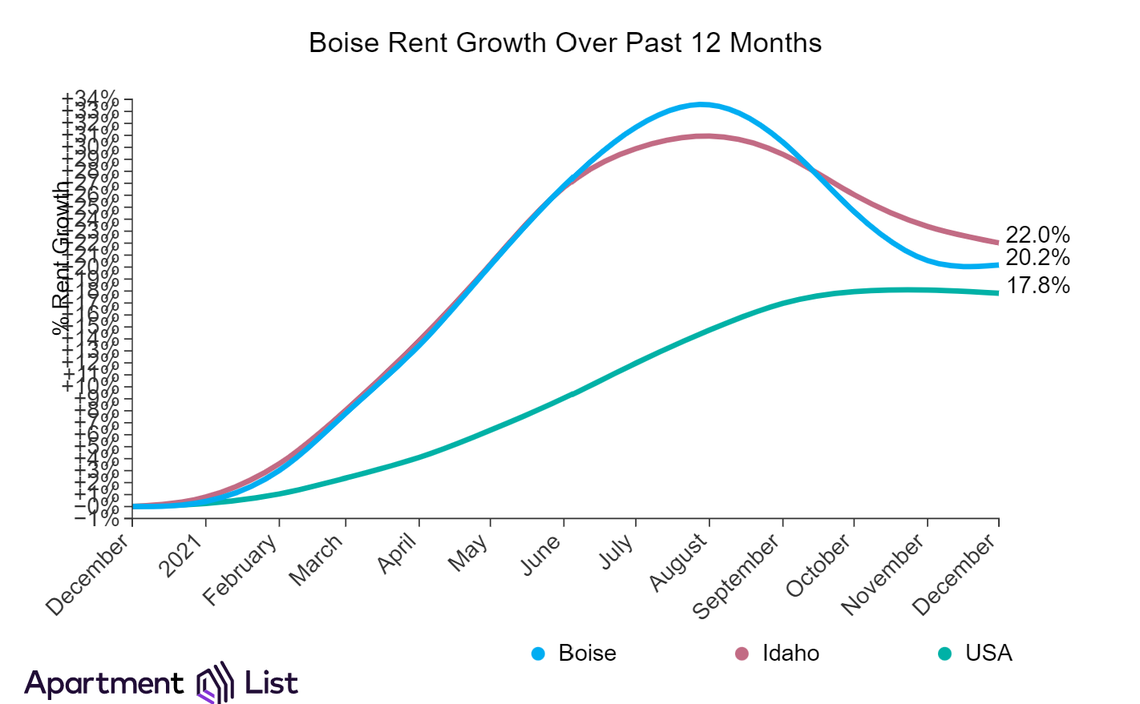 Despite the small drop at the end of the year, 2021 was still very good for Boise landlords and apartment management companies. Rent prices rose by 20.2%, coming in above the national average of 17.8%. Rent prices grew by 22% across the state of Idaho as a whole.