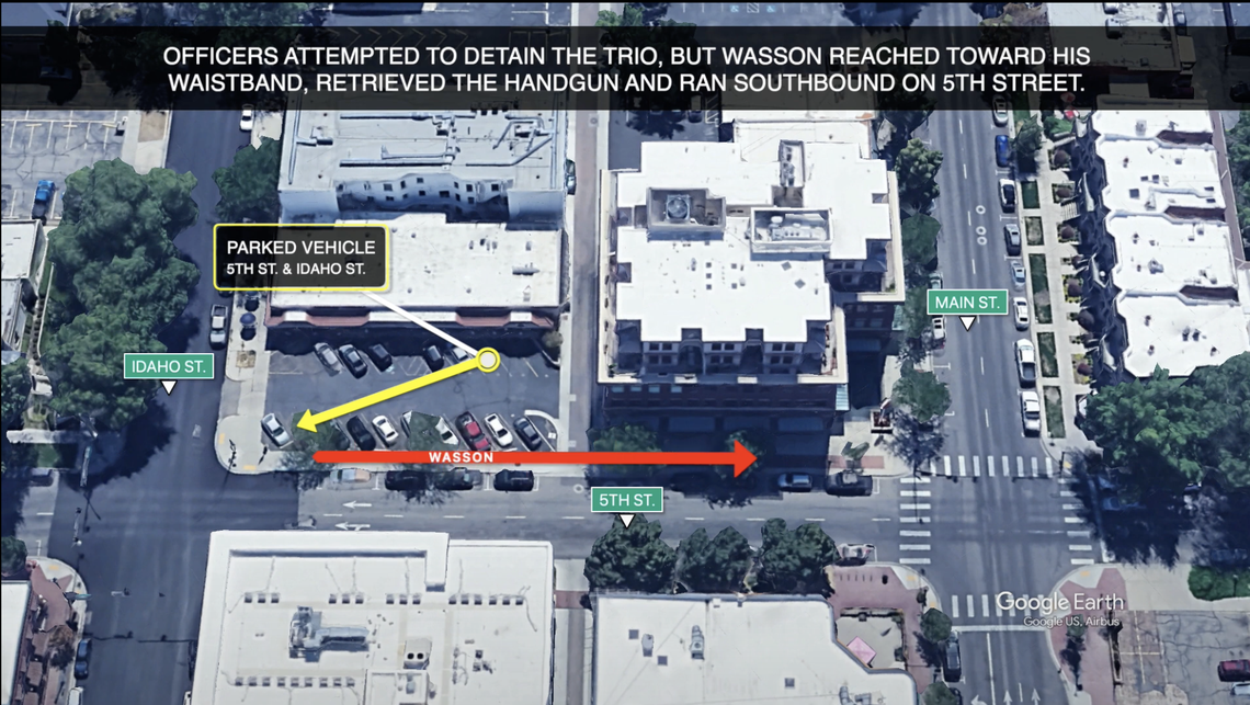 In the body-cam footage, Feldner and two other officers, Boise Police Cpl. Brian Holland and Boise Officer Chase Fiddler, attempted to detain the trio after officers saw a weapon inside Garza’s vehicle earlier in the night. Neither Wasson nor Garza legally could possess a gun because of past felony convictions.