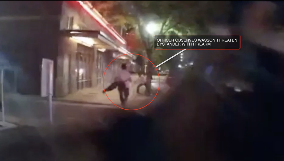 The roughly 8-minute video, which was edited with portions of the body-cam footage and included text describing the incident, showed that Wasson was armed, though he never points it at the officers.
