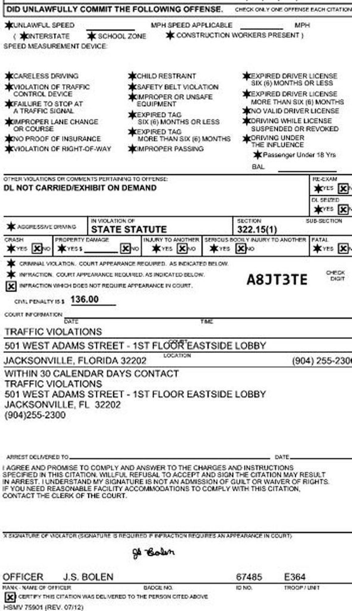 One of Bolen’s citations says Shipman violated Florida Statute 322.15, which states, “Every licensee shall have his or her driver license, which must be fully legible with no portion of such license faded, altered, mutilated, or defaced, in his or her immediate possession at all times when operating a motor vehicle and shall present or submit the same upon the demand of a law enforcement officer or an authorized representative of the department.”