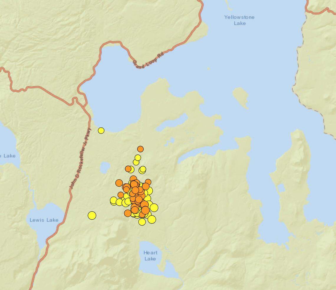 A swarm of 91 earthquakes rattled the Yellowstone National Park region in just 24 hours on Thursday, according to the United States Geological Survey. The quakes trembled southwest of Yellowstone Lake between Heart Lake and West Thumb.