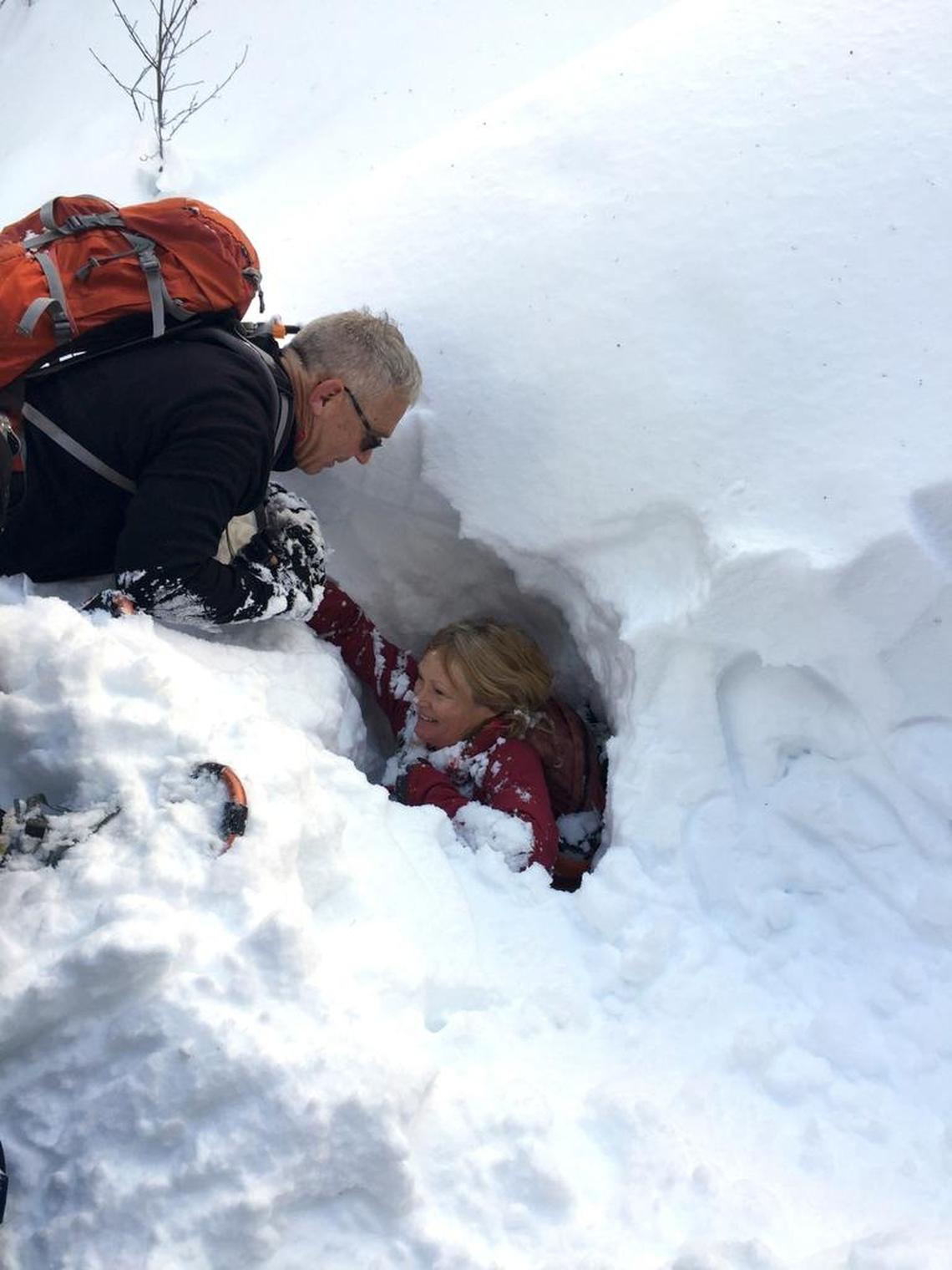 Hennessy lowered Purchase into the snow in a spot where he figured she’d sink into a creek bed — and she got stuck. At one point, Andy Traub of Boise also was holding onto her. When he lost his grip, she didn’t move. That’s when we realized she had already hit bottom. Out of the frame to the right was a hole at ground level. Purchase was able to crawl out that way. See the video below.