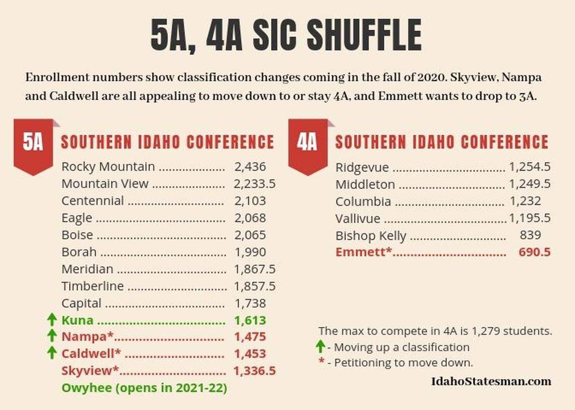 Other schools across the state fighting their placement include Canyon Ridge (remain 4A with 5A numbers), Idaho Falls (remain 4A with 5A numbers) and Shelley (drop to 3A with 4A numbers).