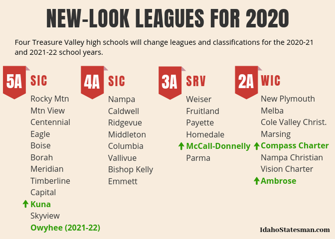 Movers in the Treasure Valley are Kuna (4A to 5A), McCall-Donnelly (2A to 3A), and Compass Charter and Ambrose (both 1A Division I to 2A).