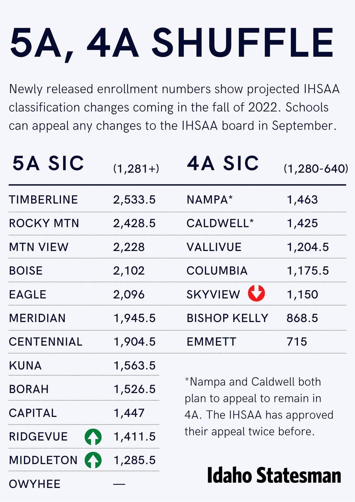 The Boise area’s two largest classifications will trade teams once again. Growth pushes two Canyon County schools — Ridgevue (1,411.5 students) and Middleton (1,285.5) — to 5A enrollment levels for the first time. Meanwhile, Skyview (1,150) would fall back to 4A