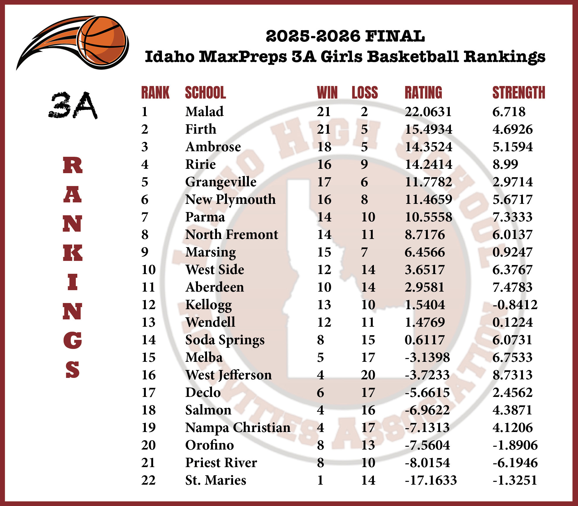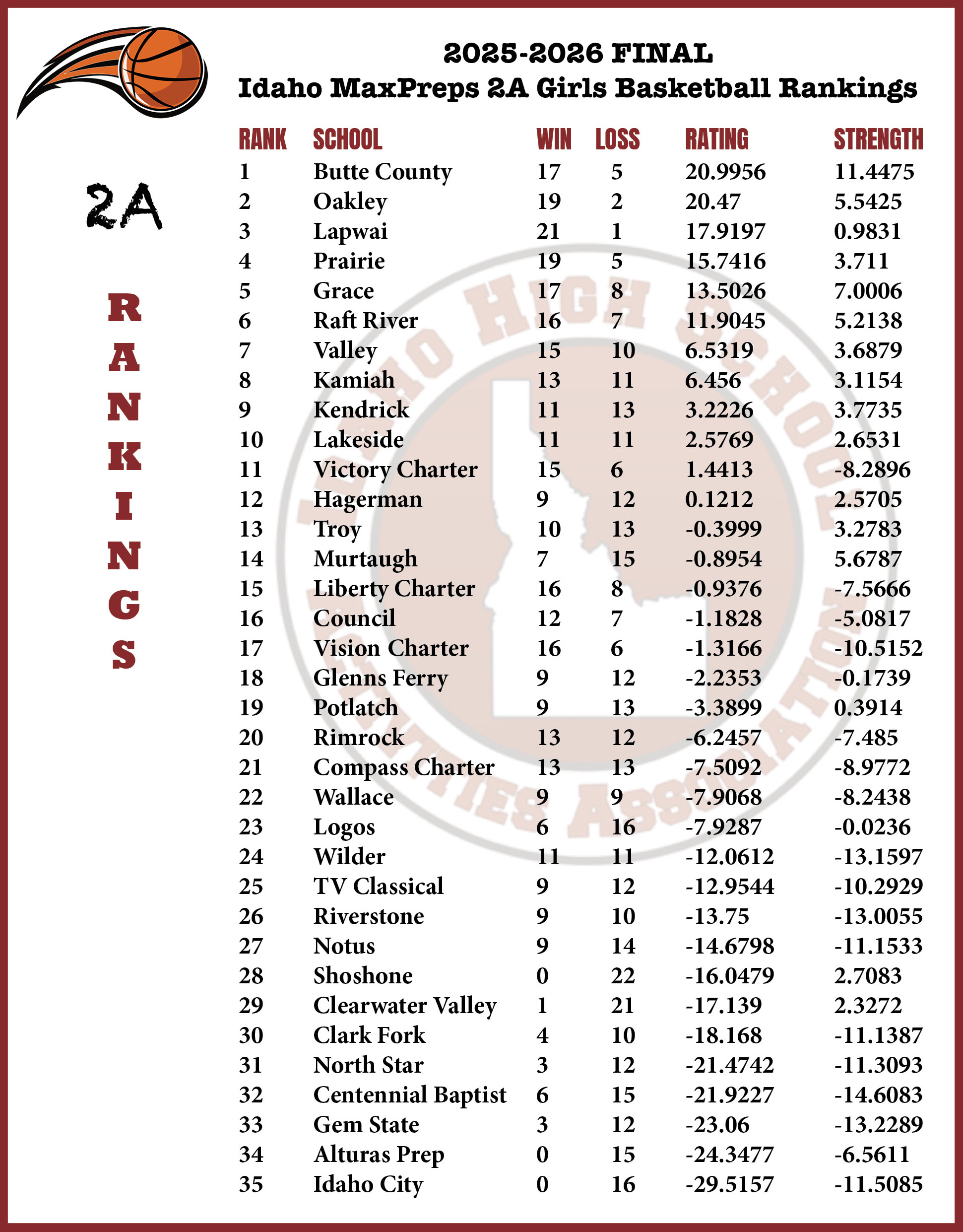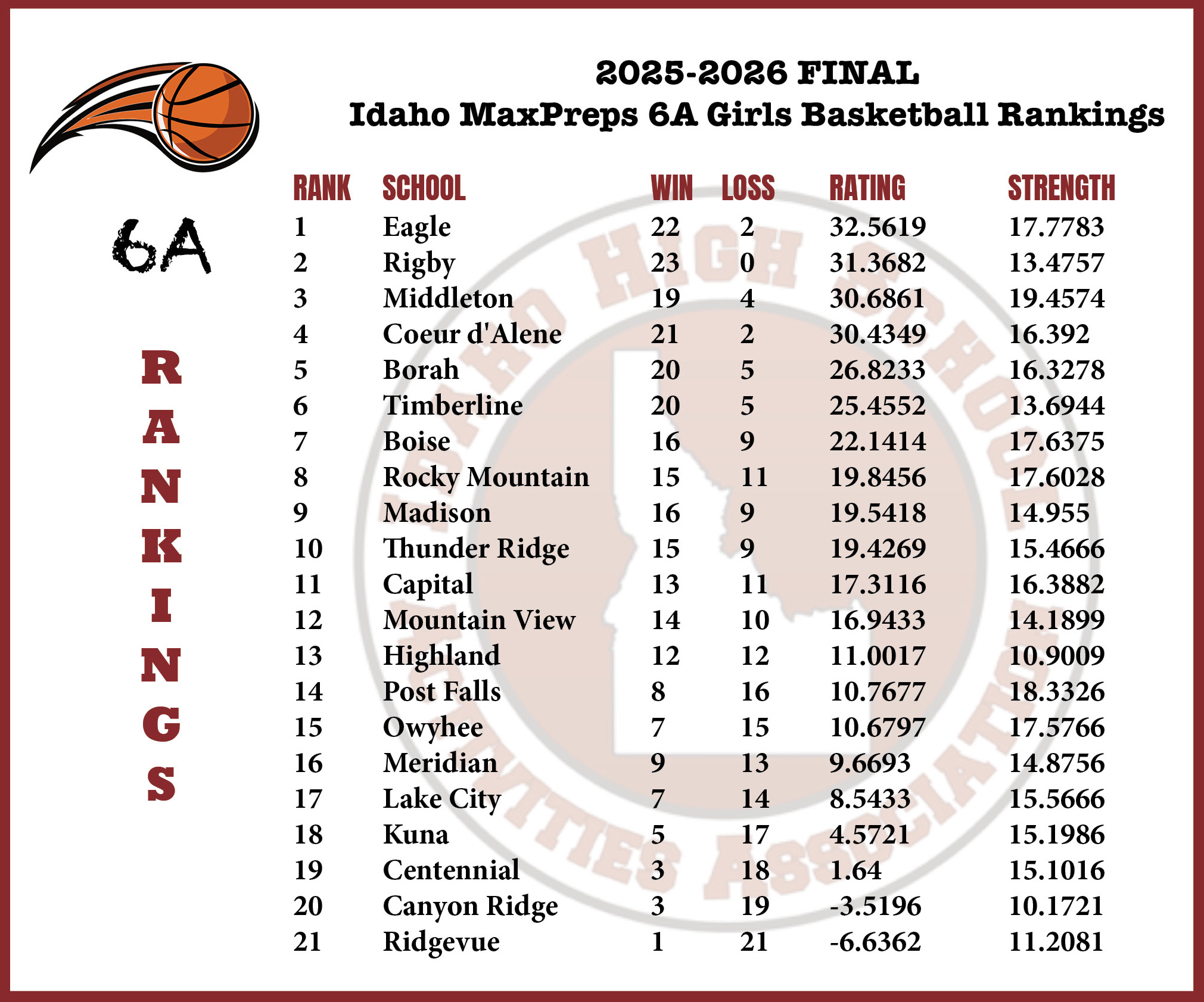THE FAVORITE: Reigning state champ Oakley (19-2) brings back a veteran squad to chase another banner. All five starters are seniors, including second-team All-Idaho guard Taylin Beck. All that experience created the state’s top defense (29.1 ppg) across all classifications. The Hornets’ only losses this season came to undefeated Sugar-Salem and 3A state qualifier Ambrose.