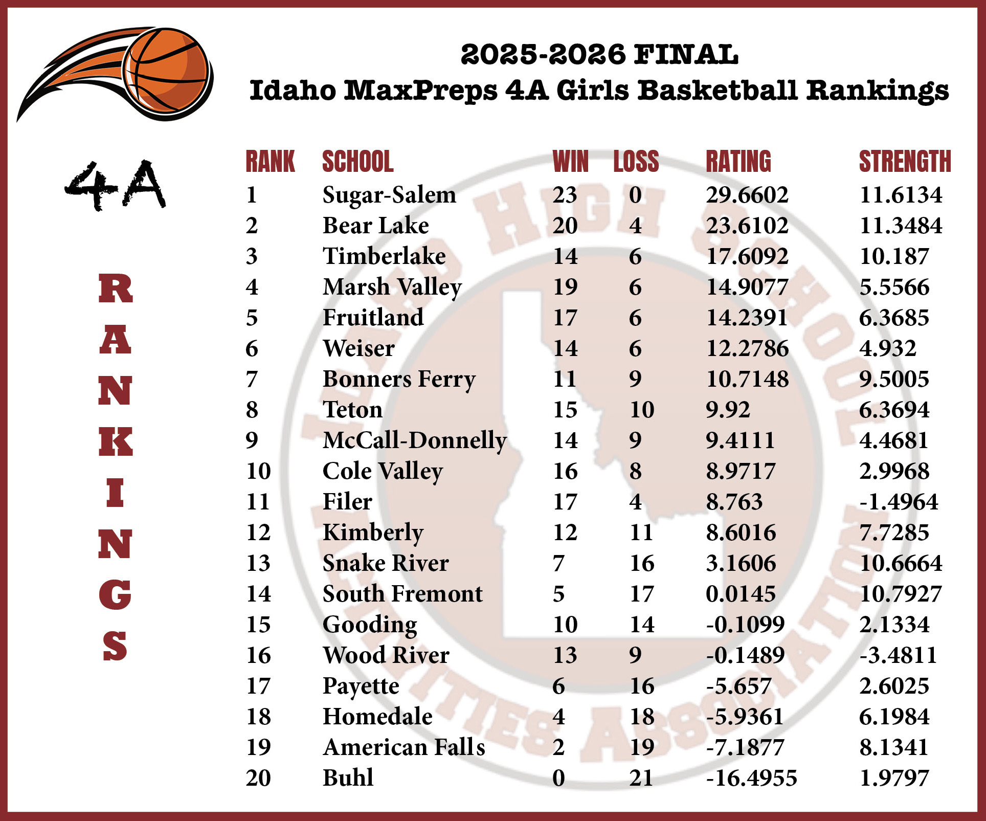 THE FAVORITE: Graduation left Sugar-Salem (23-0) with only three returning players from last year’s championship team. But the Diggers remained untouchable, winning games by an average of 23.3 points to enter the tournament on a 49-game winning streak. Sugar-Salem sought out 4A’s toughest schedule and still went 11-0 vs. 5A to 2A state qualifiers behind junior point guard Andee Petterson (17.1 ppg, 7.1 assists), a first-team All-Idaho pick last year.